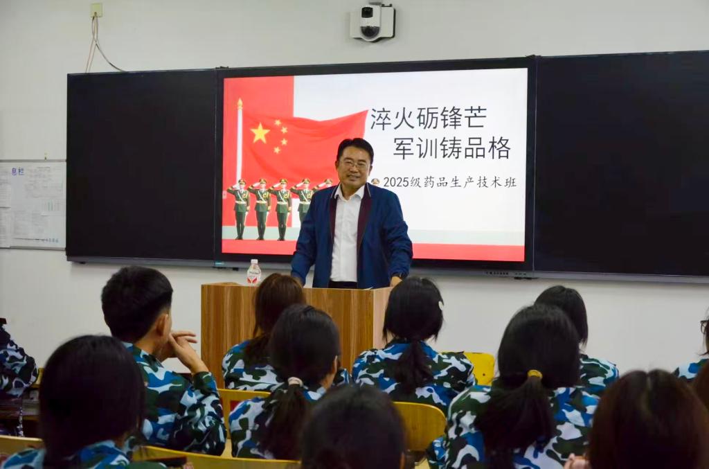 10月9日,学校纪委书记韩百宝参加2025级药品生产技术班“淬火砺锋芒 军训铸品格”军训动员主题班会。