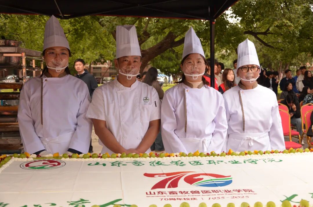 校庆日当天,我院师生和校企合作企业齐上阵精心布置了冷餐区的物品摆放。校庆70周年定制蛋糕制作得到校企合作单位青岛丹香投资管理有限公司的支持,派出企业糕点师傅,与我院教师、毕业生及在校生代表组成的师生团队携手协作,共同完成了这份专属校庆献礼。现场还有学生制作的饼干,山东新和盛飨食集团有限公司、华宝食品股份有限公司、山东合力牧业有限公司等校企合作企业的产品,得到了与会领导和嘉宾的一致称赞。